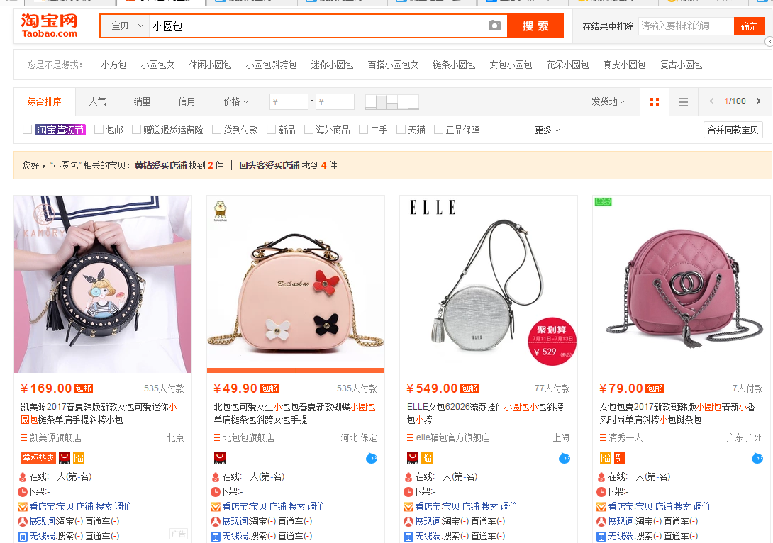 我们知道能够描述一个产品的核心词有很多,举个例子。上图宝贝我们能想到什么词来描述它?单肩包?小挎包?小圆包?这些都是他的核心词吗?现在我们去将他们放入搜索框去搜索。